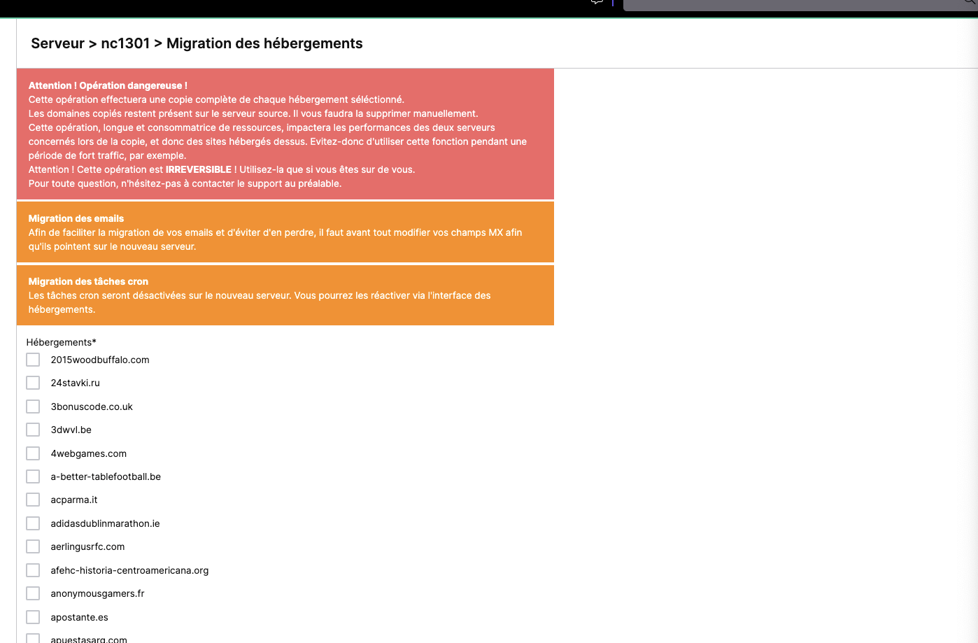 Cliquer ensuite sur le bouton "migrer" et vous arriverez sur cette page (https://n-admin.nexylan.com/servers/nc1301/hosting/migrate):