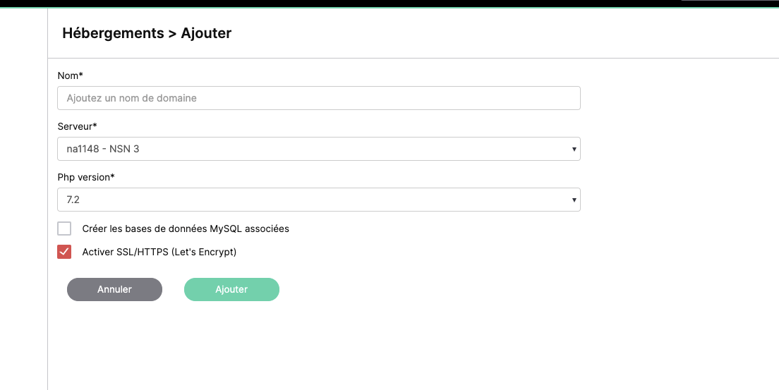 Renseigner le nom de domaine du site en question et vous pouvez cocher "Créer les bases de données MySQL associées" et "Activer SSL/HTTPS"