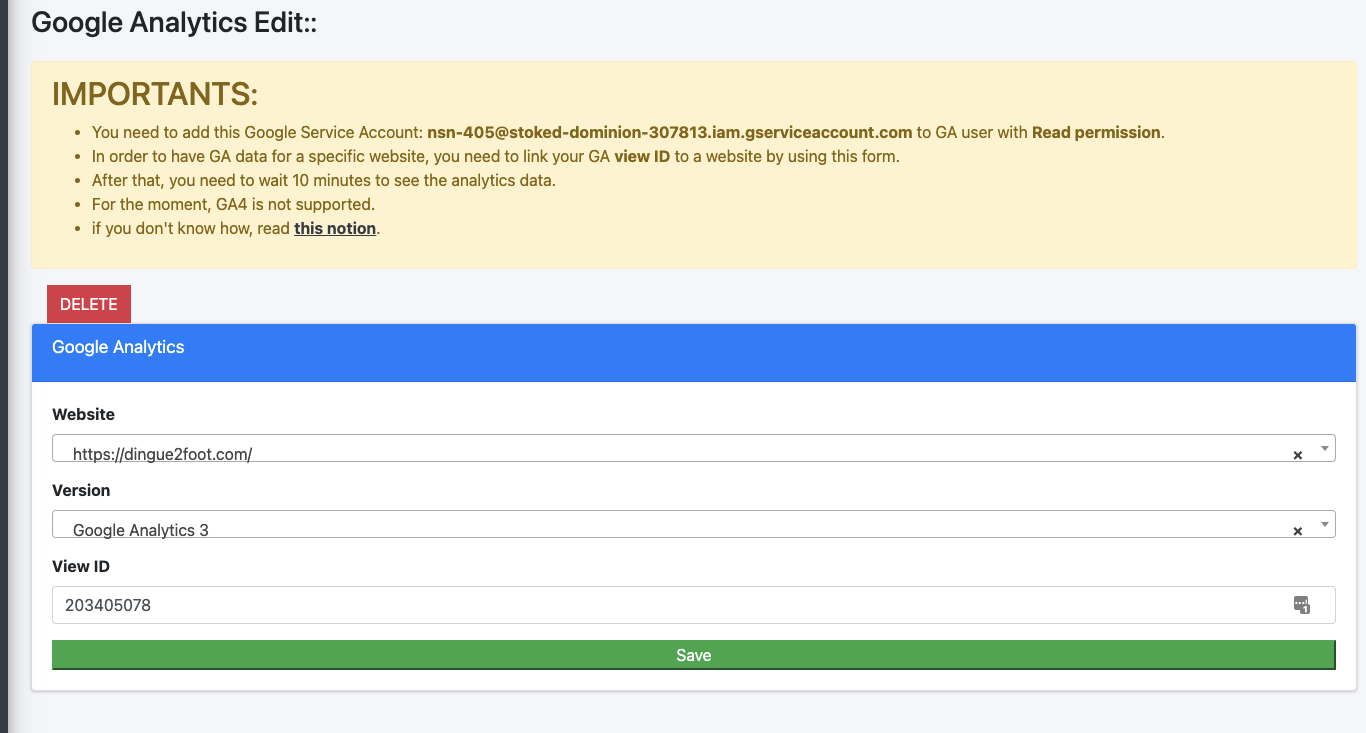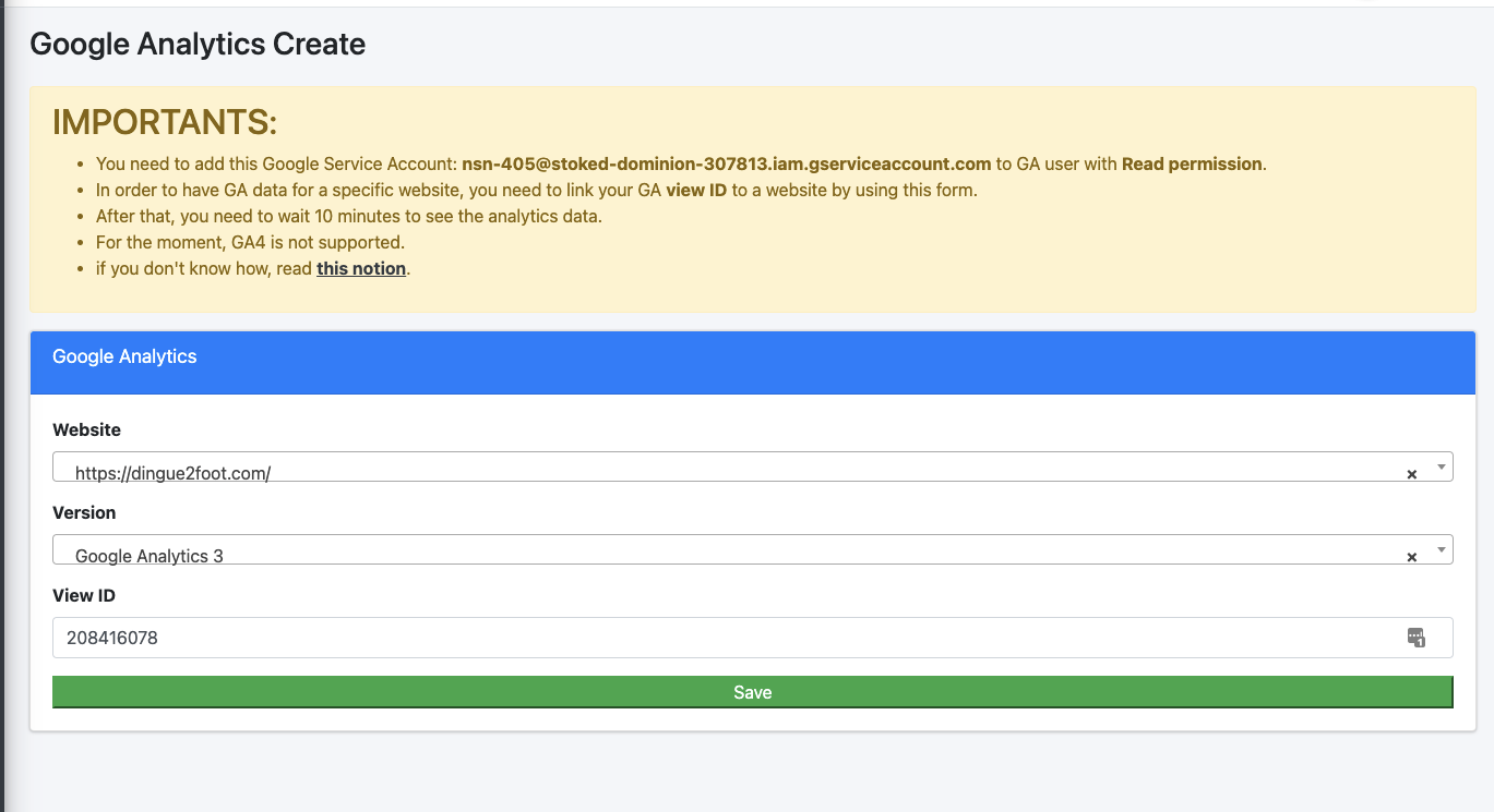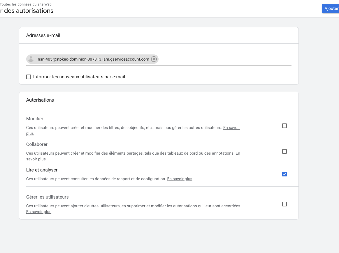 1 . Add NSN google account service to GA with the correct permissions