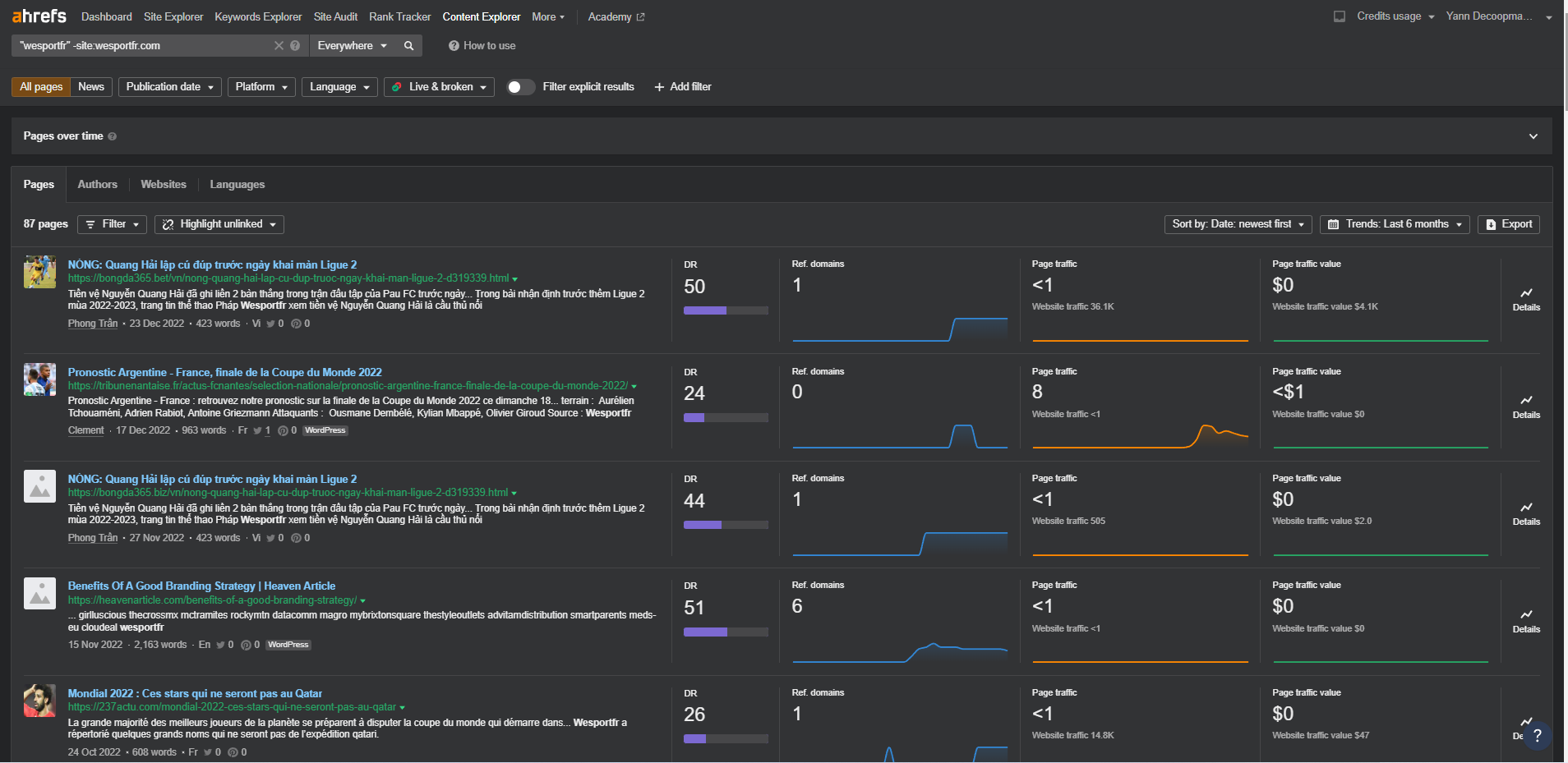we have the list of sites evoking the targeted keyword. Here, the example is with a domain name to show the mentions outside the indicated site (here: wesportfr).