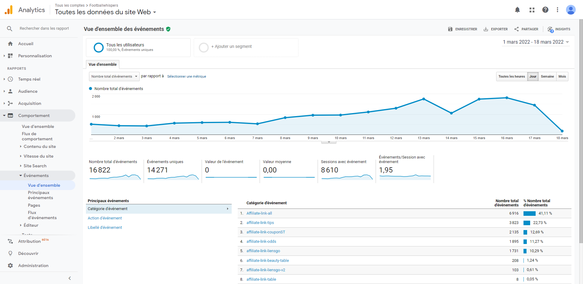 - Une fois lo code mis en place, vous retrouverez les statistiques dans Google Analytics : Comportement > Evénements
