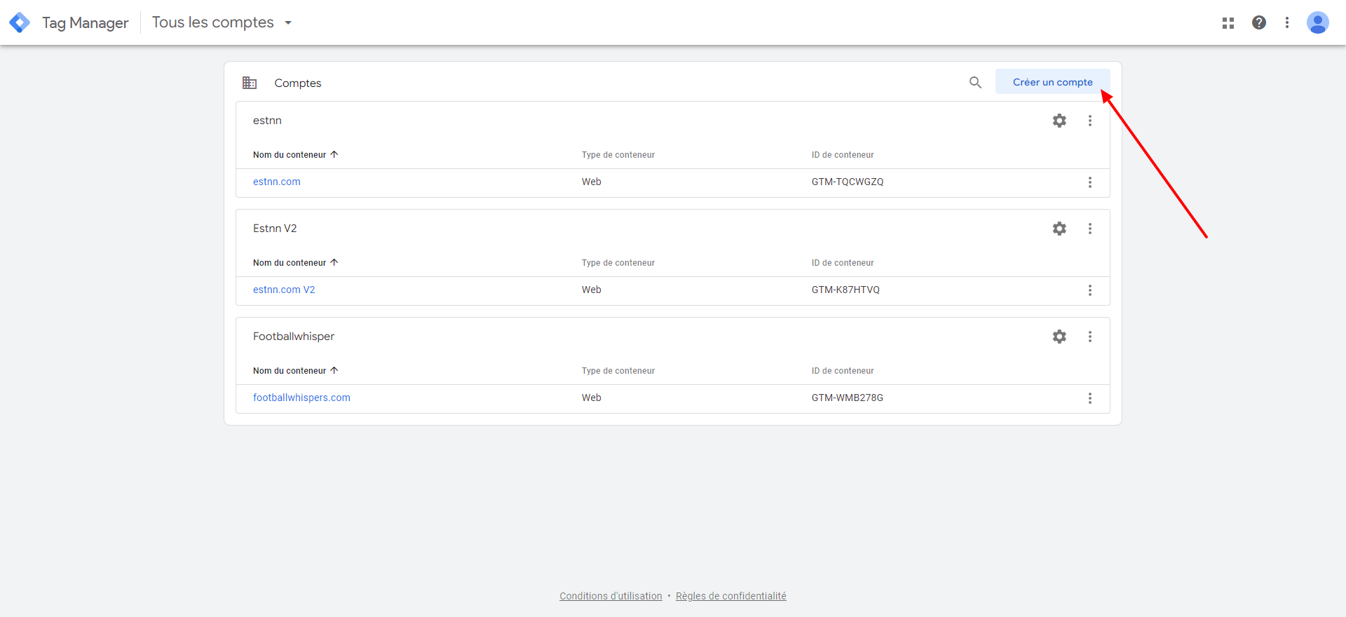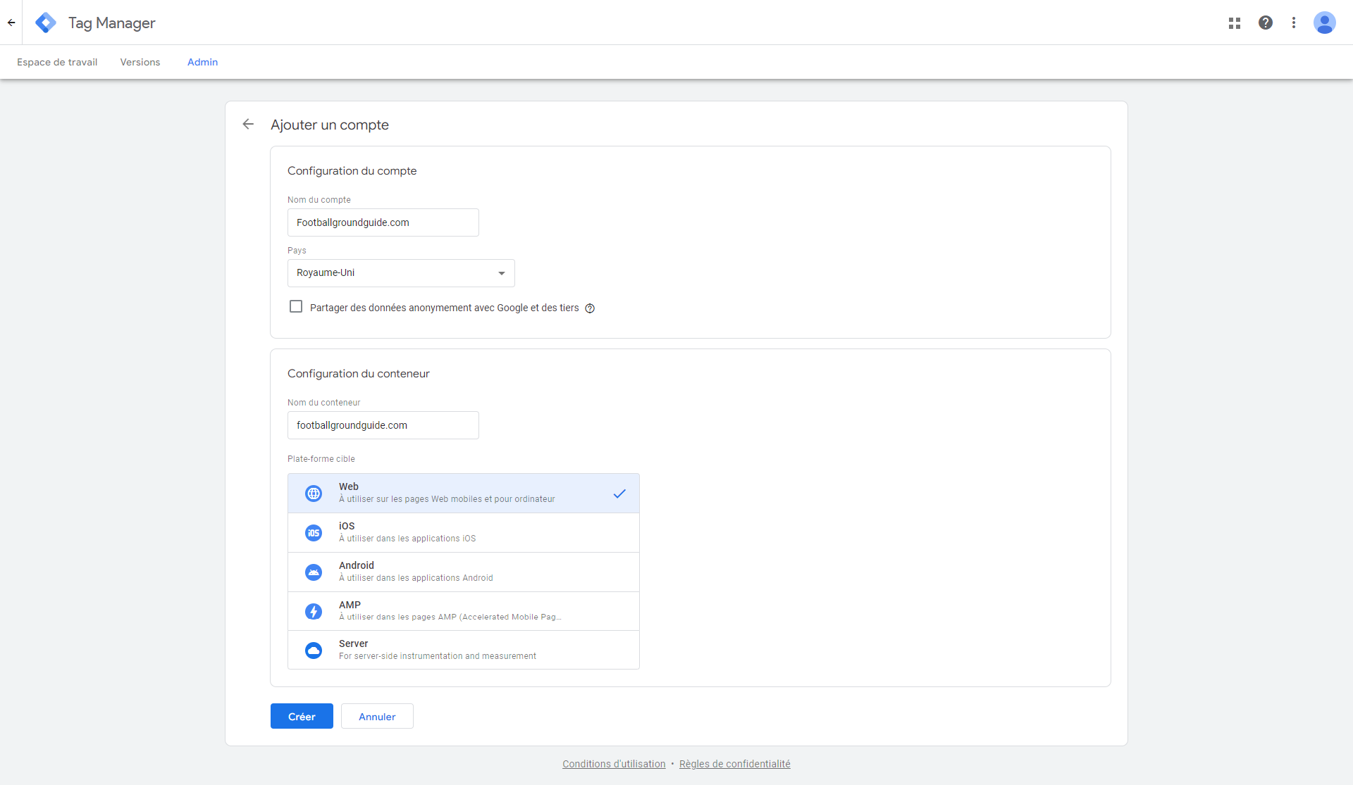 - Renseigner le nom du compte (indiquer le domaine), le pays, ne pas cocher le partage des données, le nom de domaine et le type de plate-forme (sauf exception, “Web”)