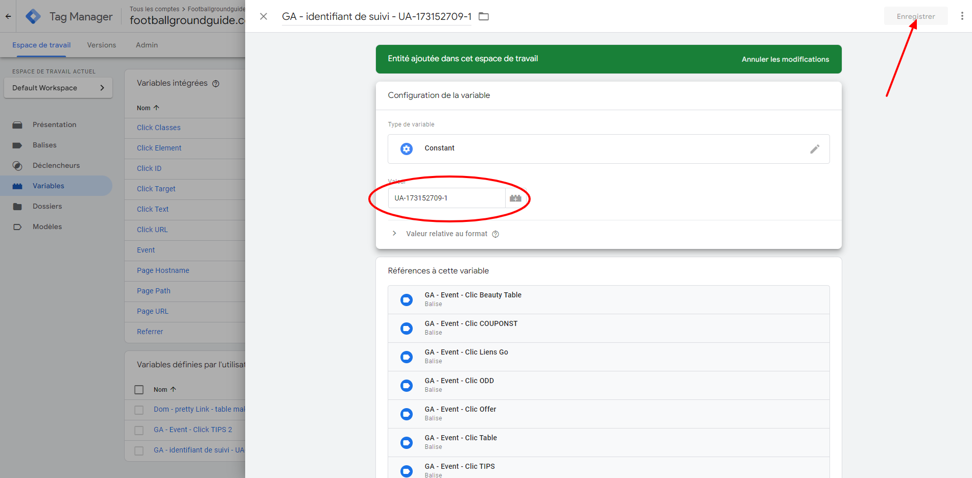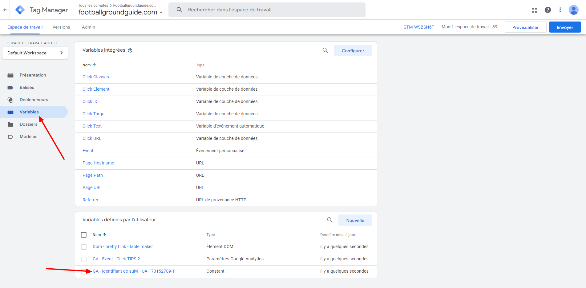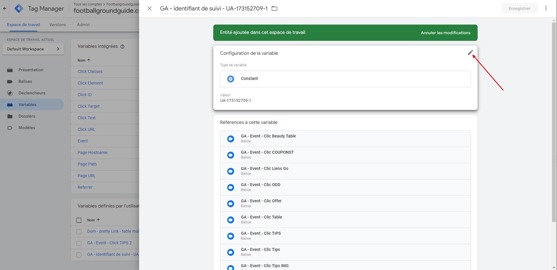 - Dans la sidebar, cliquer sur “Variables” puis modifier la variable “GA - identifiant de suivi - UA-173152709-1”
