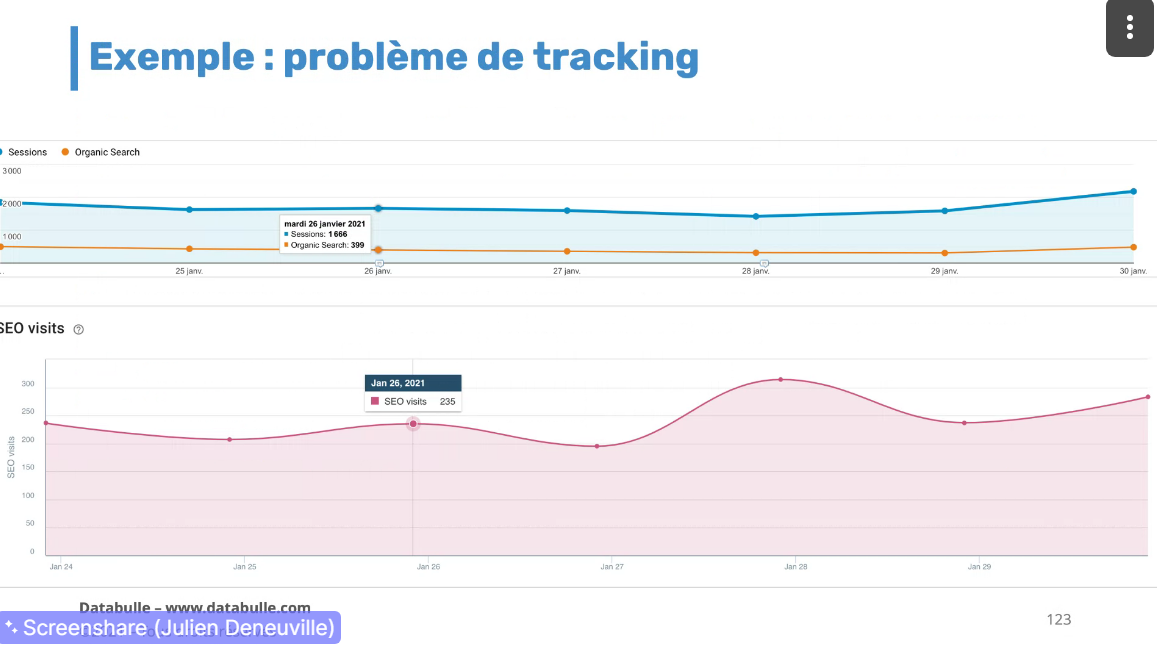- Google Analytics : ne pas regarder que le traf SEO, regarder le traf total et les autres canaux d'acquis - peut permettre de remonter des soucis/voir pb de tracking