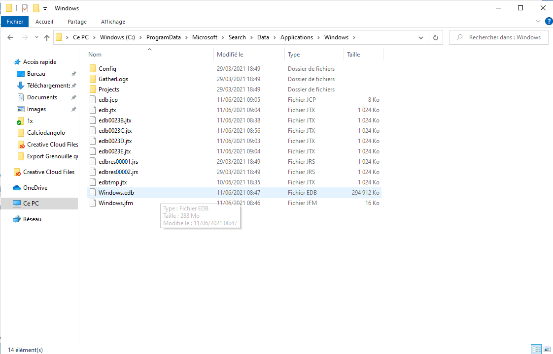 Go to C:\programdata\Microsoft → Search → Data → Application → Windows